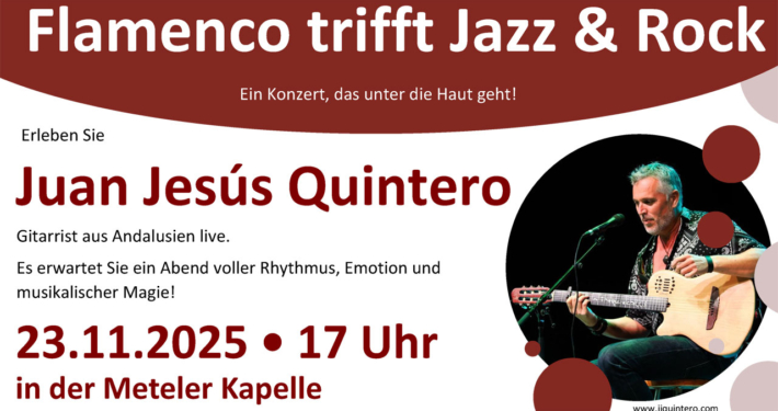 Sonntag, 23.11. um 17 Uhr: Flamenco trifft Jazz & Rock – Ein Konzert, das unter die Haut geht! Erleben Sie Juan Jesús Quintero, Gitarrist aus Andalusien, live. Es erwartet Sie ein Abend voller Rhythmus, Emotion und musikalischer Magie!